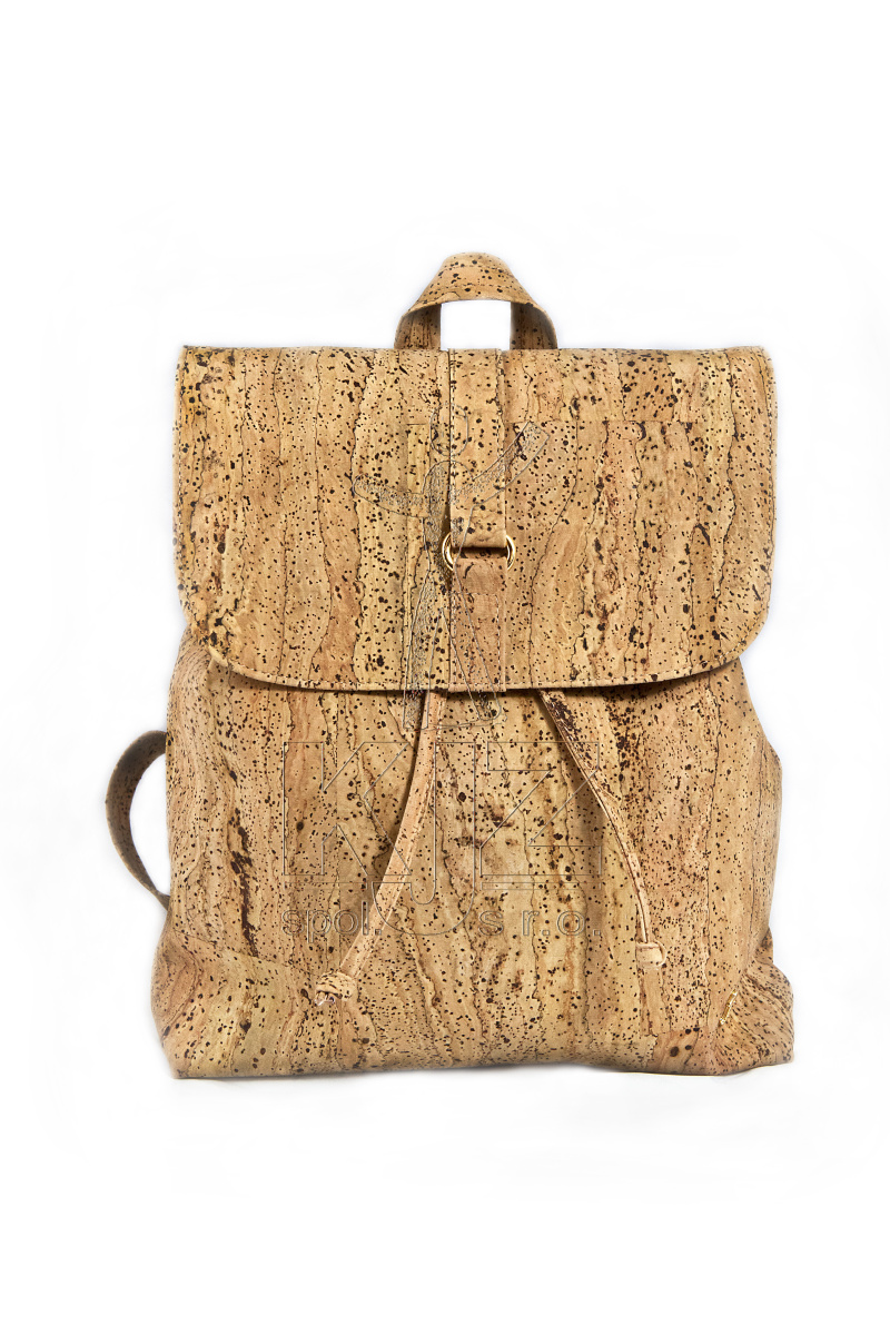 Překrásný batoh z korkové látky s ozdobou na klopě a pevným dnem. Popruhy jsou nastavitelné. Uzavírá se staženými korkovými šňůrkami a magnetickým patentem, ve vnitřní části jsou 2 kapsy, jedna je opatřená zipem.