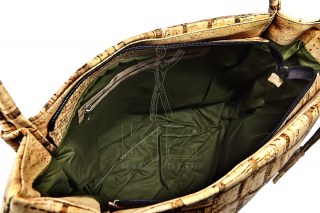 Nádherná velice elegantní kabelka větších rozměrů pro denní nošení je opatřena dvěmi delšími uchy spojenými ozdobou ze žlutého kovu s tělem kabelky. Spodní část je opatřena kovovými nožičkami. Na jednom uchu je připevněna odnímatelná ozdoba z korkové látky. Zavírání kabelky je jištěno zipem, uvnitř jsou dvě kapsy na doklady, jedna je opatřená zipem.